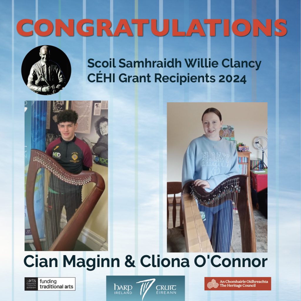 CÉHI, in partnership with Scoil Samhraidh Willie Clancy is delighted to award Cian Maginn and Cliona O’Connor grants to attend the Willie Clancy Summer School between 6th-14th July this year. The festival features a star-studded line up of musicians and harpers, including Kathleen Loughnane, Gráinne Hambly, Laoise Kelly, Cormac de Barra, Máire Ní Chathasaigh, Aisling Lyons, Deirdre O’Brien, Paul Dooley and many more.