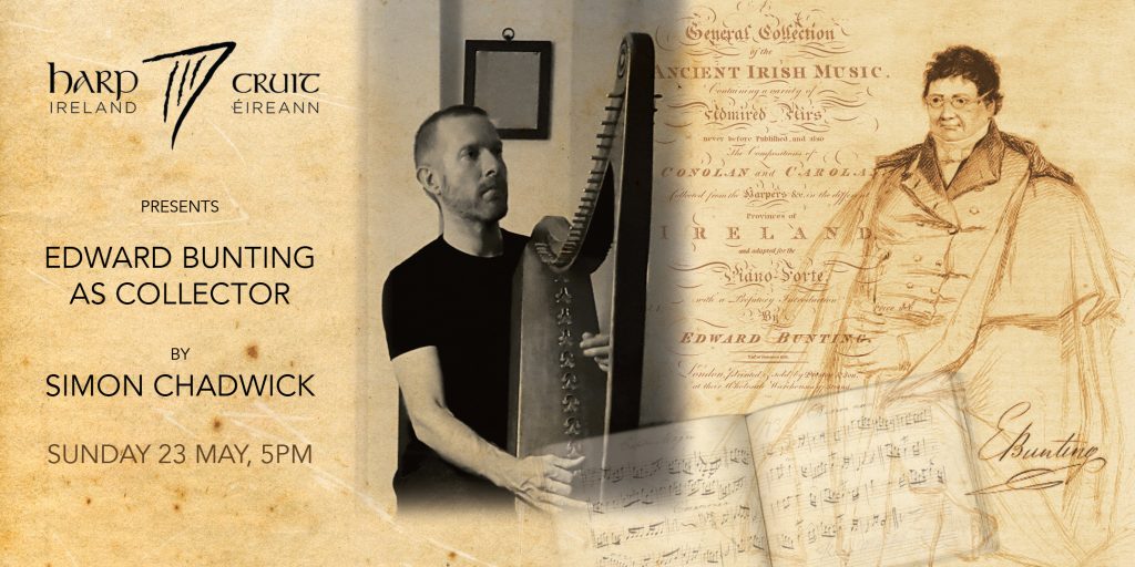 Cruit Éireann, Harp Ireland presents our Annual Lecture 2021  ‘Edward Bunting as a Collector’ – a live, online talk by Simon Chadwick, Sunday 23 May 2021, 5pm.