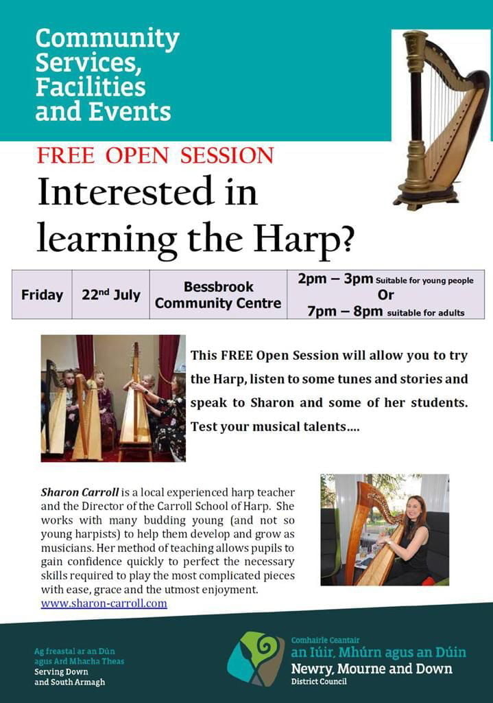 This free open session will allow you to try the harp, listen to some tunes and stories and speak to Sharon Carroll and some of her students.
