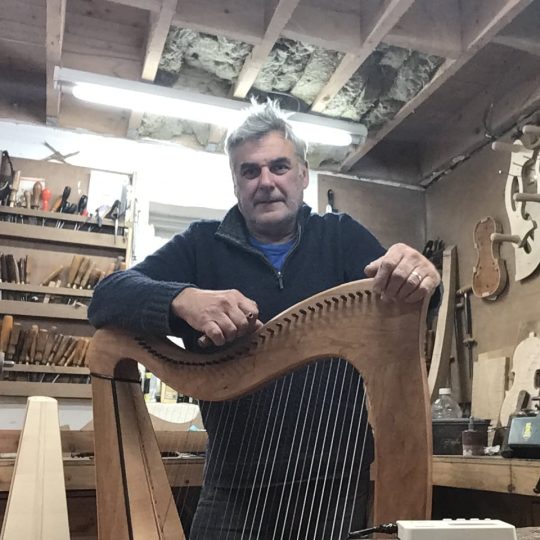 My eldest daughter was learning the harp and needed one. I had a lot of encouragement from her teacher, Laoise Kelly. I had been making violins for nearly forty years and it was an exciting challenge. Funnily enough, there was a harp maker based at the violin-making school in Wales where I learned my trade, maybe I should have paid more attention in class! Now I make harps in the West of Ireland. Some of my violin-making colleagues think I’ve “gone over to the dark side” but I love it.