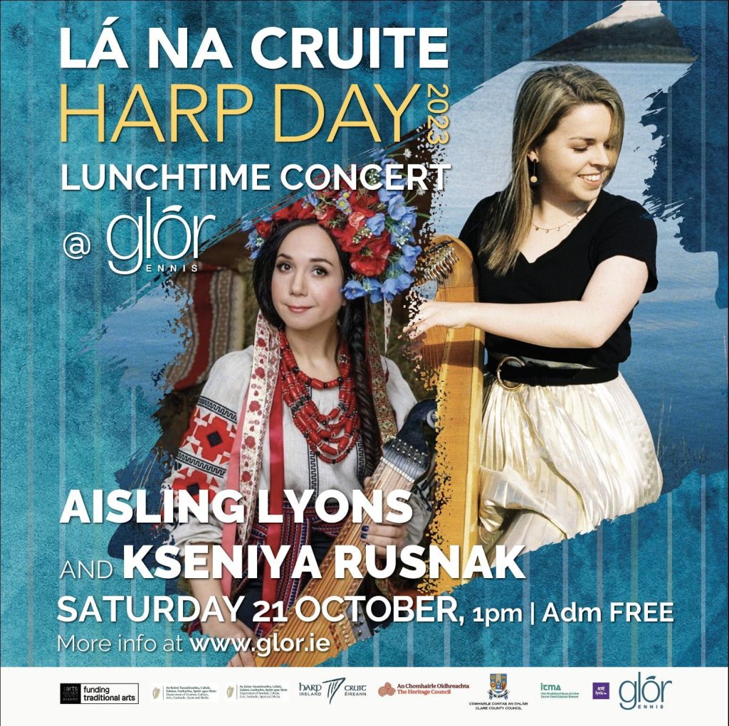 Celebrate Lá na Cruite │Harp Day at Glór and enjoy the immense talents of Aisling Lyons on traditional Irish harp and Kseniya Rusnak on the Ukrainian bandura. Aisling, a multi award-winning musician & composer from Co. Clare, has been described as ‘the finest Irish harper at work today’ by Songlines Magazine following the release of her debut album Aistear. Kseniya is an exceptional musician and composer from Kyiv who taught at the Kyiv Conservatory of Music before her departure from Ukraine.