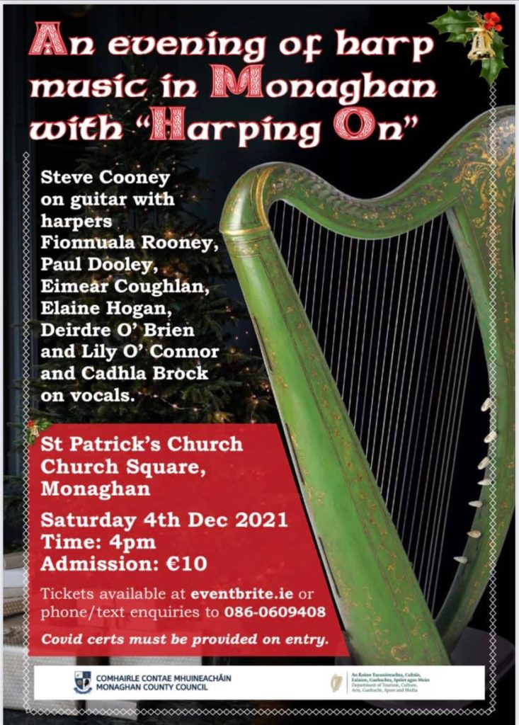‘Harping on’ in St. Patricks Church Monaghan, Saturday 4th December at 4pm. Tickets are limited due to social distancing and they are selling well so book early to avoid disappointment.