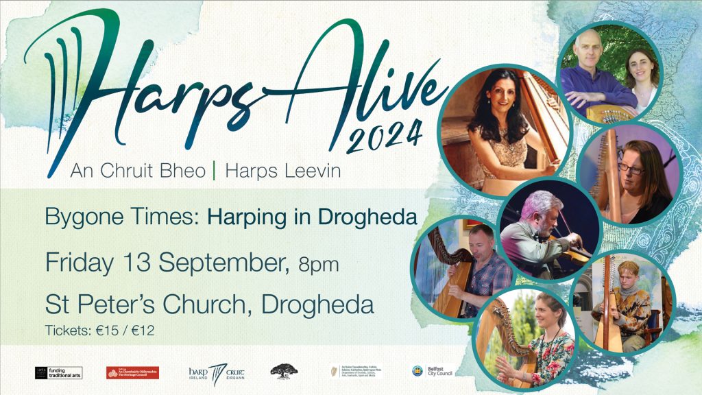1844 – the year that the Irish Harp Society in Drogheda held their Grand Harp Concert featuring performances of Carolan’s airs as well as the music other eminent harper-composers. Revisit the story of the Drogheda Harp School and the music performed 280 years on in St Peter’s Church, Drogheda. Featuring Teresa O’Donnell Gráinne Hambly & William Jackson, Deirdre Ní Bhuachalla & renowned fiddle player, Gerry O’Connor, Cormac de Barra, Adam O’Neill, Eilís Lavelle and the Music Generation Louth Harp Ensemble.