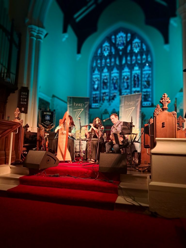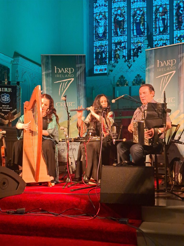 Mick, Louise and Michelle Mulcahy took to the stage to perform a vibrant series of sets for the second half of the concert. An acclaimed family of traditional musicians who were awarded with a Gradam Ceoil in 2023, they showcased a wide range of traditional tunes, compositions and mastery of an array of instruments. We were delighted that Michelle and Louise placed not one, but two UNESCO intangible cultural heritage instruments centre stage with harp and uilleann pipes duet.