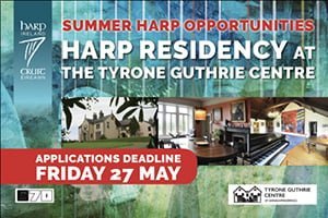 The residency includes both emerging and established harpers/harper composers in either the Traditional Arts or Music, living on the island of Ireland. Send your CV and a letter of application clearly outlining a rationale for ‘time spent’ at the Tyrone Guthrie Centre at Annaghmakerrig. Full details at https://www.harptest.actondev9.com/summer-harp-opportunities-harp-residency-at-the-tyrone-guthrie-centre/