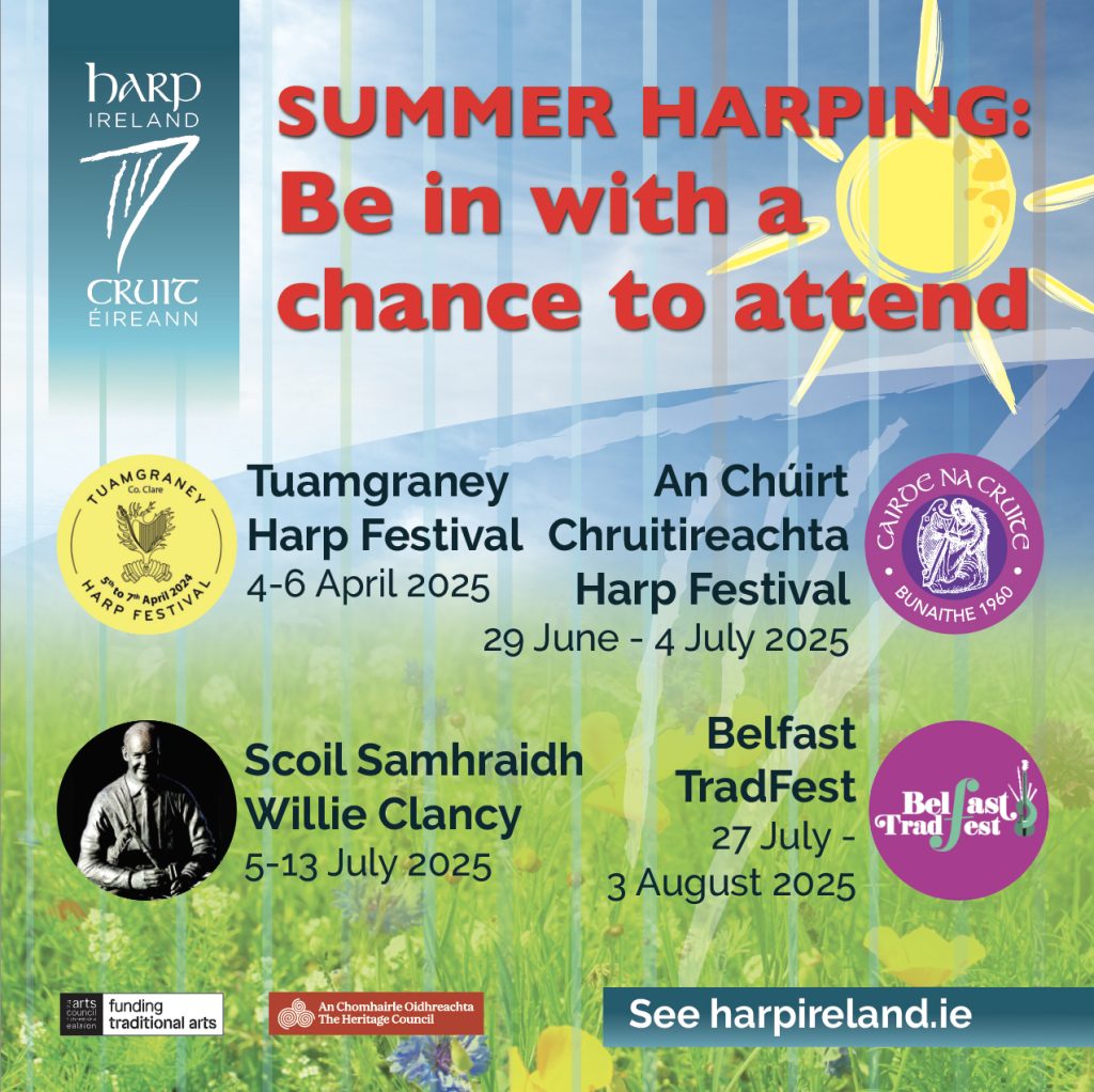 Cruit Éireann | Harp Ireland in partnership with Tuamgraney Harp Festival, Cairde na Cruite, Scoil Samhraidh Willie Clancy, Belfast TradFest, Centre Culturel, Irlandais and The Tyrone Guthrie Centre are delighted to announce a range of sponsored harper opportunities this summer to support the rapidly growing interest in Irish harping.