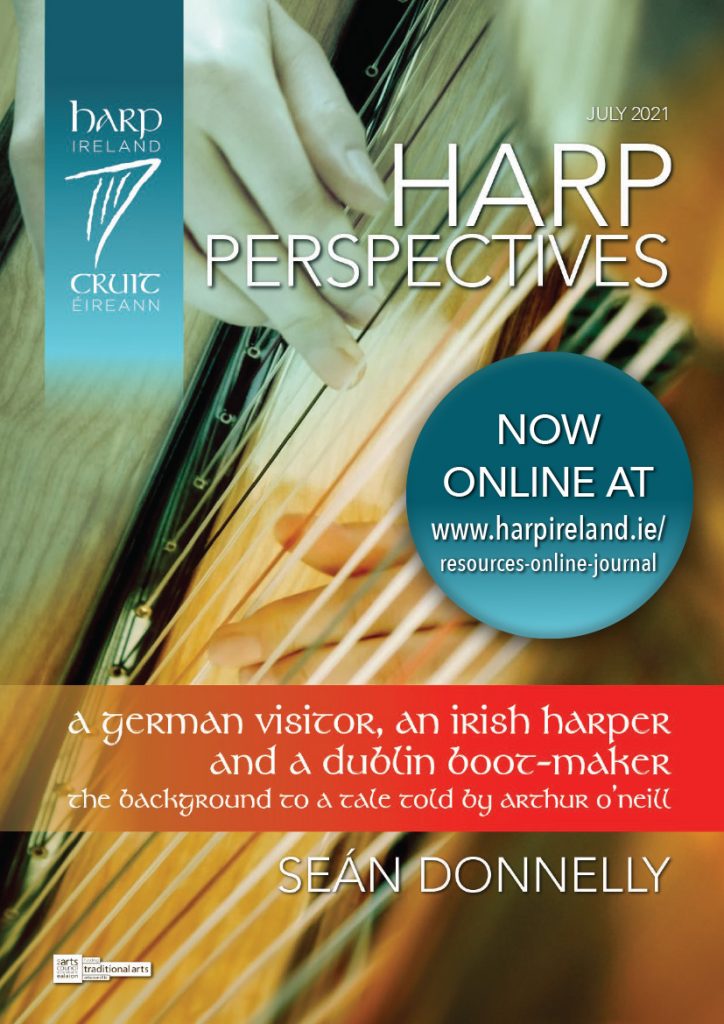 Our July edition of Harp Perspectives featuring Seán Donnelly’s article – A GERMAN VISITOR, AN IRISH HARPER, AND A DUBLIN BOOT-MAKER: The Background to a Tale Told by Arthur O’Neill – is now online at https://www.harptest.actondev9.com/resources-online-journal/